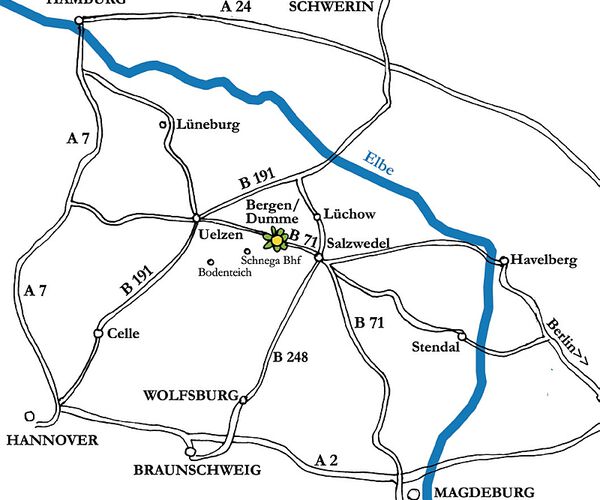 An das Bahnnetz ist unser Landkreis auf der Bahnstrecke Hamburg- Salzwedel- Berlin über Schnega-Bahnhof angeschlossen. In Uelzen ist im Jahre 2000 der Bahnhof nach Plänen von Friedensreich Hundertwasser reizvoll restauriert worden. Nach einem Besuch dieses weltweit einzigen Hundertwasser-Bahnhofs können Sie wieder einsteigen und die 20 Minuten Richtung Salzwedel zum Schnega Bahnhof fahren. Und jetzt beginnt Ihre Fahrradtour mit dem ersten Stop nach 5 km in der Duft- und Wandelgärtnerei Schoebel. Ideen und Pflanzenraritäten werden Sie überraschen. Doch keine Angst, daß die Packtaschen schwerer werden. Wir versenden Ihnen alles termingerecht, so daß Sie Ihren Garten nach der Tour sofort verschönern können.